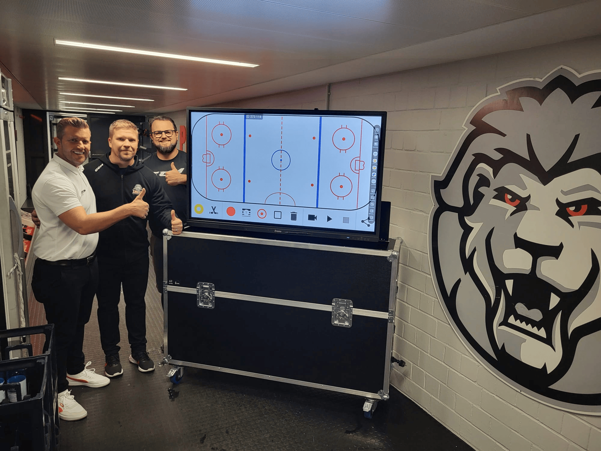 Schon bei der Übergabe zeigte sich der praktische Mehrwert der Lösung: Headcoach Matti Tiilikainen ging gemeinsam mit einem Spieler direkt in eine Spielszene aus Düsseldorf hinein, während weitere Spieler den Austausch aufmerksam verfolgten. So wird Videoanalyse zu einem sichtbaren, interaktiven Bestandteil des Teamalltags — unmittelbar, verständlich und nah an der Situation.