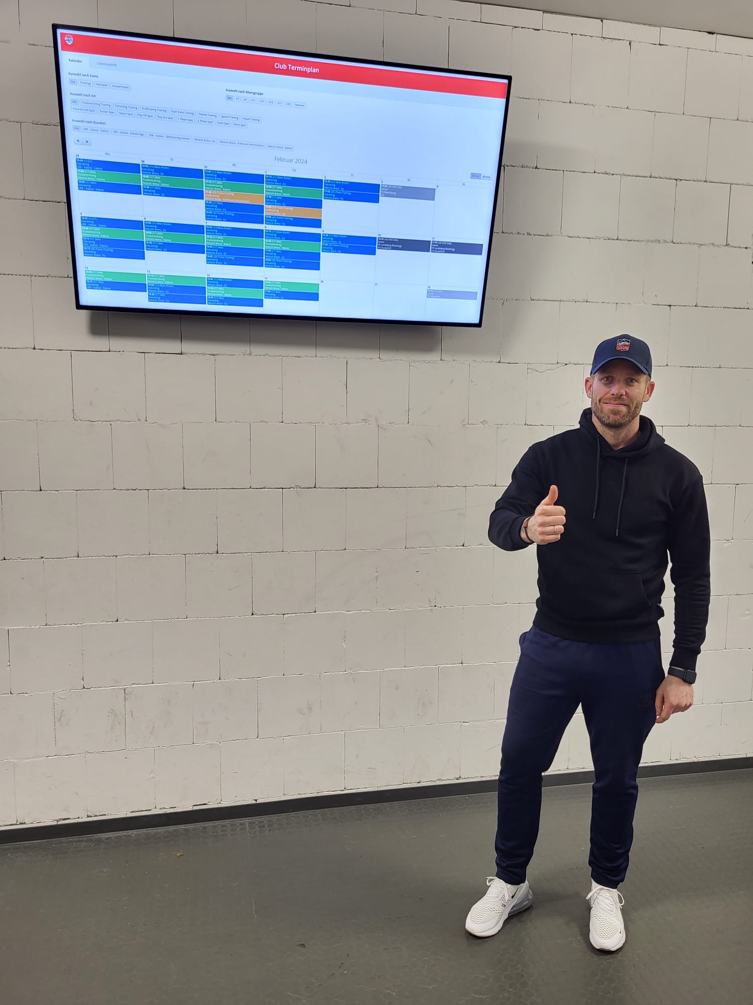 Dafür wurde im Eingangsbereich zum Kabinentrakt ein 65-Zoll-Display installiert, über das aktuelle Trainingszeiten, clubinterne Informationen, Bekanntmachungen sowie ergänzende Medieninhalte ausgespielt werden können. Die bisher analoge Kommunikation über Aushänge wurde damit durch eine flexible, aufmerksamkeitsstarke und leicht aktualisierbare Lösung ersetzt.